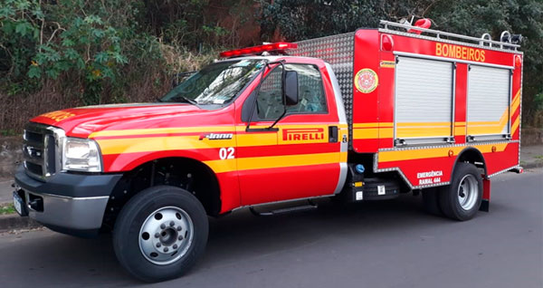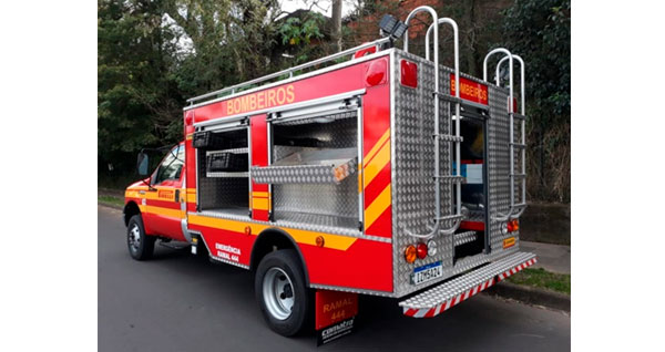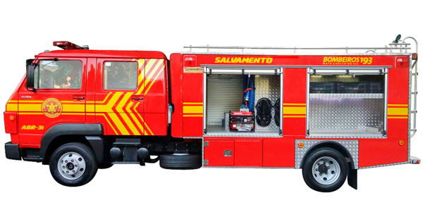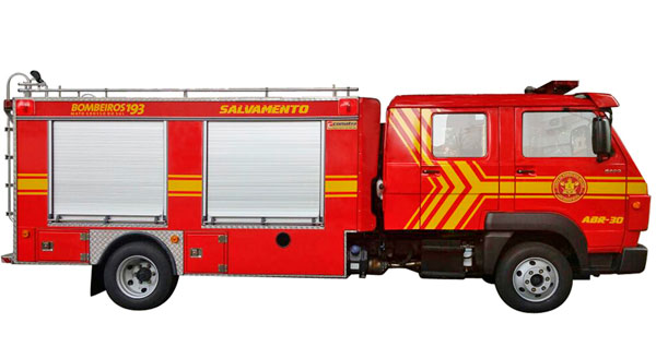Veículo de combate à incêndio cabine Dupla ou simples com capacidade de até 2.000 litros de água, com bomba de incêndio de 200 à 350 GPM, compartimentação de carga tipo persianas ou monobloco equipado com carretel de mangotinho, canhão monitor, guincho elétrico, torre de iluminação.